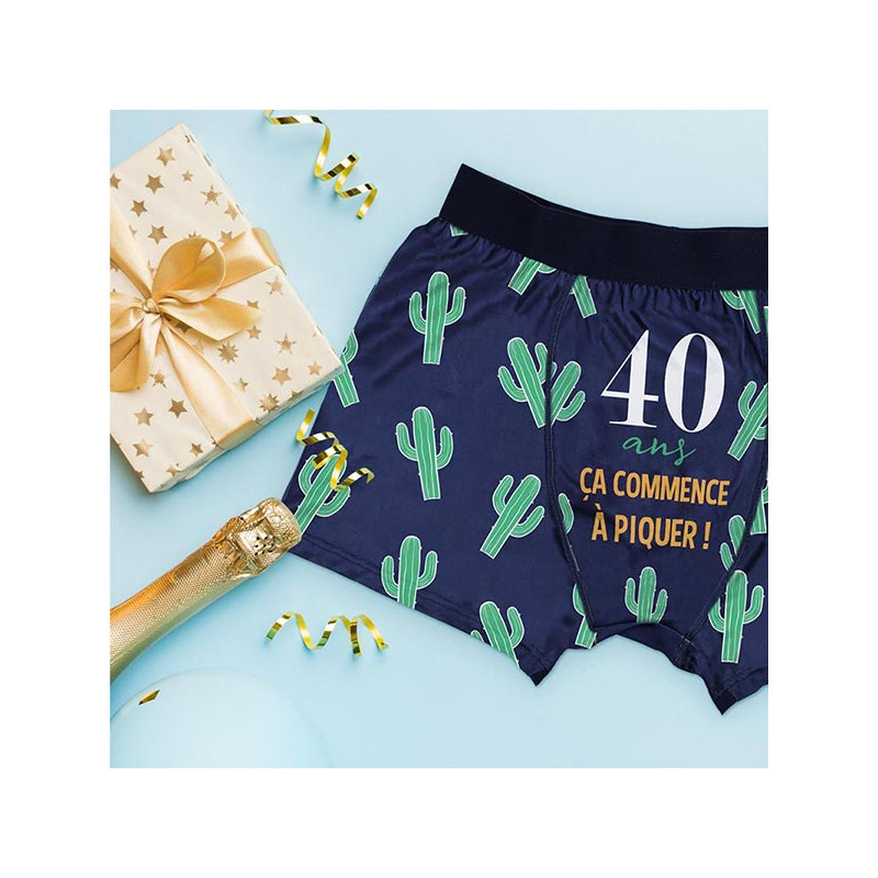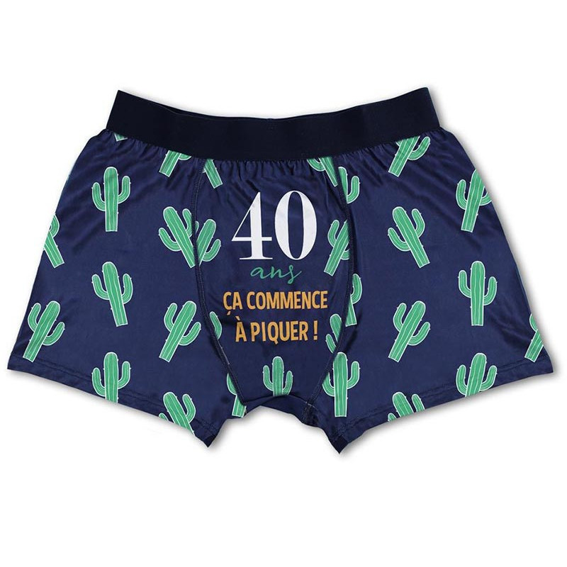 Le boxer 40 ans anniversaire est proposé en plusieurs tailles : M, L et XL. Il est bleu marine et décoré avec plein de petits cactus verts. Au milieu, on peut lire l'inscription "40 ans, ça commence à piquer !". Ce boxer anniversaire taille bien, est agréable à porter et pourra être utilisé toute l'année des 40 ans et même après. Il se lave facilement à l'envers, à 30°. C'est un cadeau 40 ans humoristique qui a généralement beaucoup de succès.
