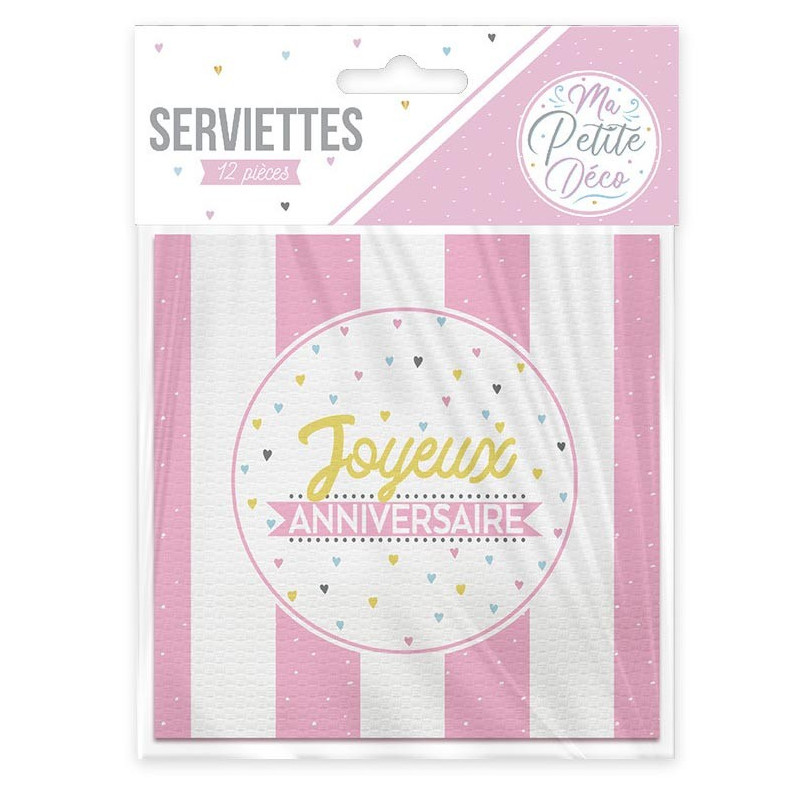 Le paquet contient 12 petites serviettes en papier d'anniversaire fille qui mesurent 13x13 cm pliées et 26x26 cm dépliées. Ces serviettes d'anniversaire sont roses, blanches et décorées avec des rayures, de petits cœurs et une inscription "Joyeux Anniversaire". Elles sont eco-responsables et seront parfaites pour un anniversaire fille ou garçon (cela dépend des goûts). Pour accompagner ces serviettes roses, vous trouverez les gobelets assortis, les assiettes, ainsi que les pailles.