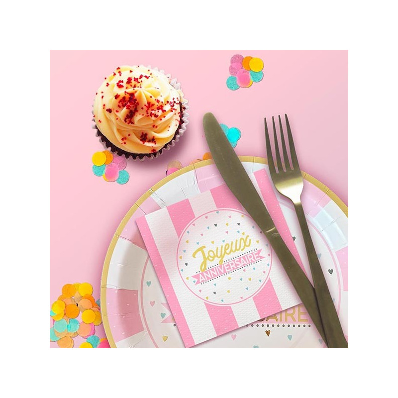 Inclus : 12 serviettes d'anniversaire roses pour fille 13x13 cm