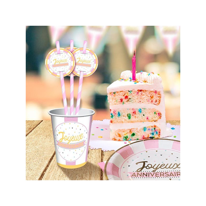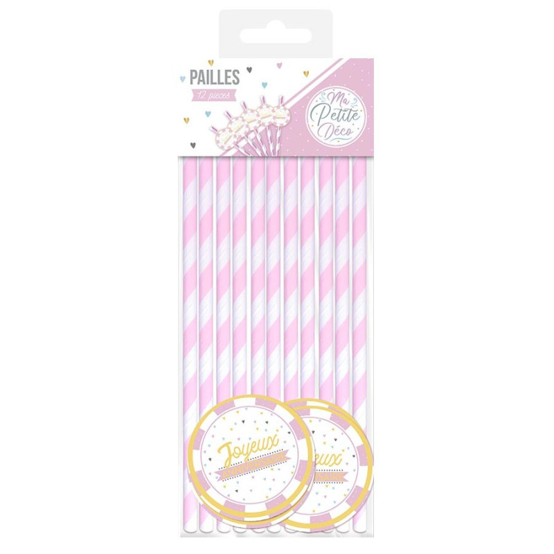 - 12 pailles d'anniversaire roses et blanches de 20cm
