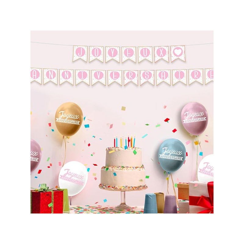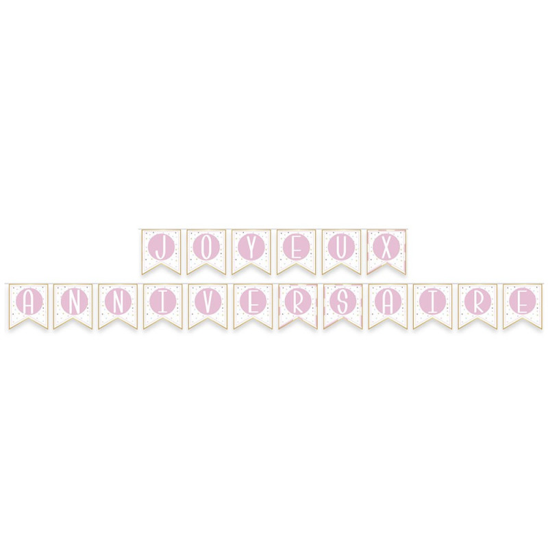 Inclus : 1 guirlande carton joyeux anniversaire rose et blanc 5m
