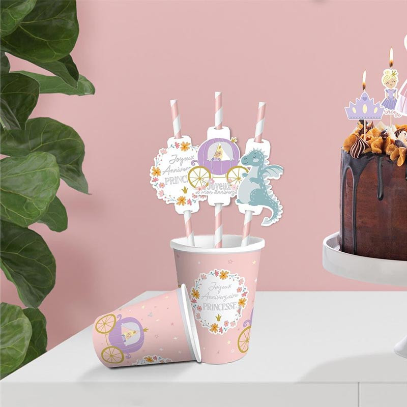 Pour accompagner les pailles d'anniversaire princesse en carton, nous avons bien entendu les gobelets en carton assortis, ainsi que les serviettes en papier et les assiettes cartonnées. Si vous souhaitez que votre table soit à 100% sur le thème des princesses, nous avons aussi des nappes assorties, des cake toppers, des bougies, des confettis de table, des pics décoratifs, ainsi que des pots à bonbons sur le thème des princesses.