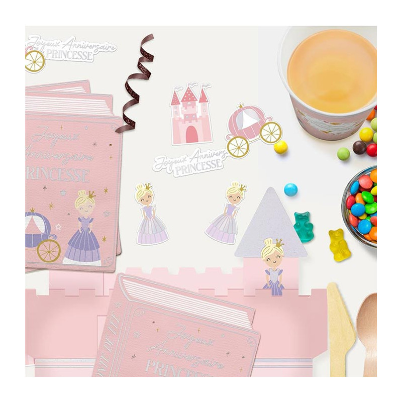 Pour accompagner ces confettis princesse et compléter la décoration de table anniversaire princesse, nous avons aussi des accessoires décoratifs comme des bougies, des cake toppers, des pics décoratifs, des pots à bonbons ou encore des nappes pour protéger la table contre les boissons renversées et les sucreries. Dans cette gamme, nous proposons aussi de la vaisselle jetable en carton assortie aux autres décorations. Vous trouverez les assiettes, les pailles, les gobelets et les serviettes en papier.