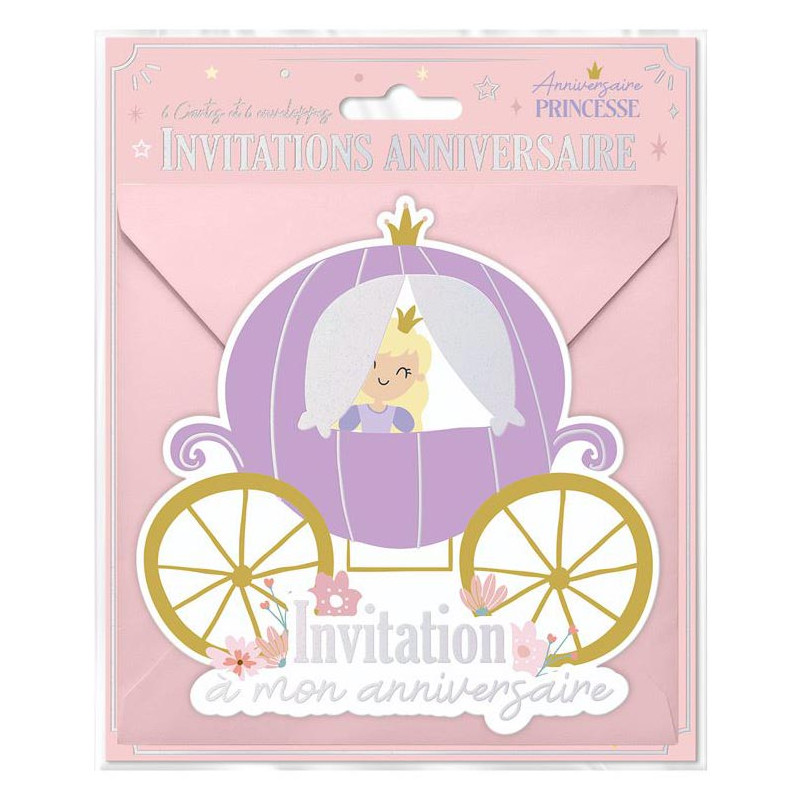 Ce paquet contient 6 invitations anniversaires princesses ainsi que 6 enveloppes. Les enveloppes sont carrées, rose pastel et mesurent 15x15 cm. En forme de carrosse de princesse, ces invitations princesses sont originales, on peut lire dans le bas une inscription argentée "Invitation à mon anniversaire". Au dos de cette carte princesse, vous trouverez un texte déjà écrit avec des pointillés pour que vous puissiez compléter.