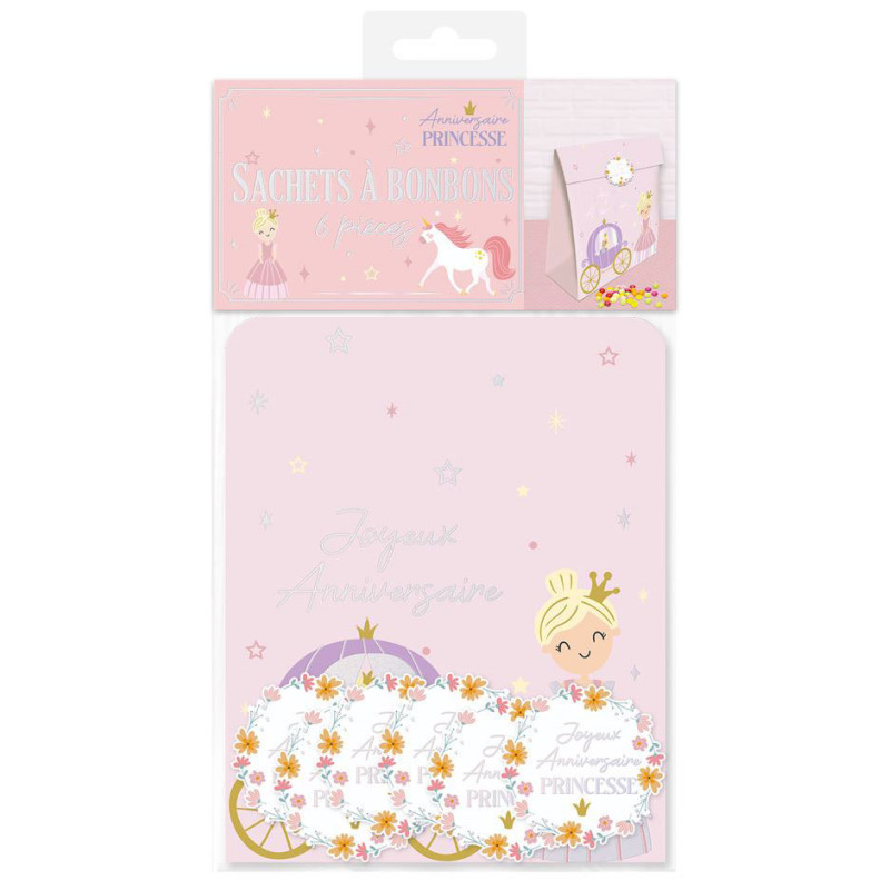 Inclus : 6 Sachets à bonbons anniversaire princesse en papier 15x12x5cm, 6 stickers