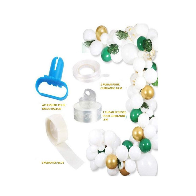 - 108 ballons, 10m de bolduc, 10 feuilles, 1 ruban de 5m, 100 points de colle, 1 outil pour nouer