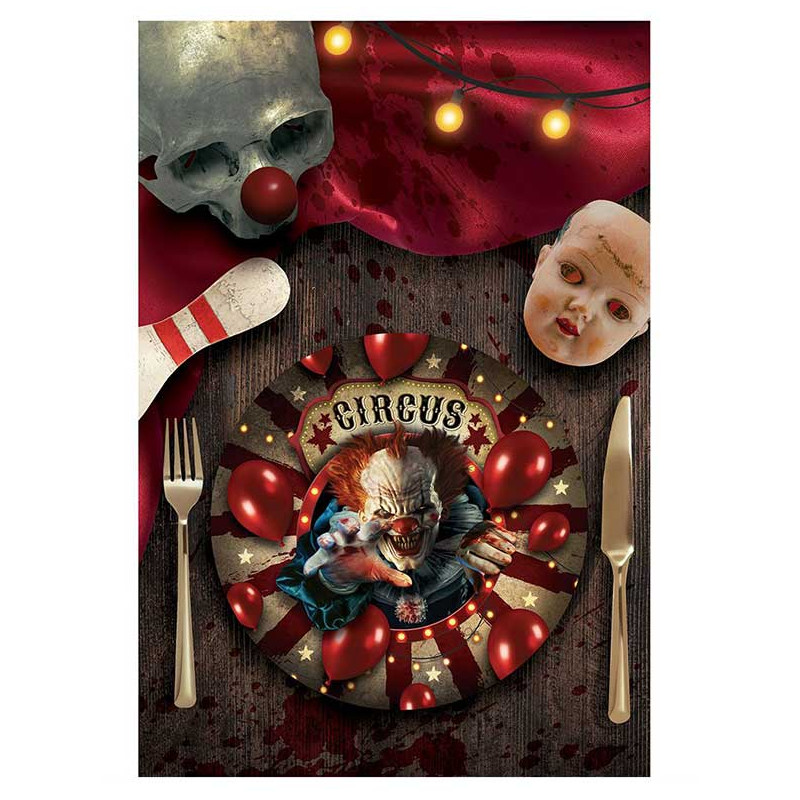 Les assiettes clown tueur d'Halloween sont assorties aux gobelets en carton, aux serviettes en papier, ainsi qu'à la nappe. C'est idéal si vous souhaitez réaliser une décoration dédiée aux clown à Halloween. Pour avoir une décoration complète, vous trouverez sur notre site de nombreuses décorations sur le thème des clowns comme des guirlandes, des automates, des ballons, des têtes de clowns à suspendre, des décorations de porte...