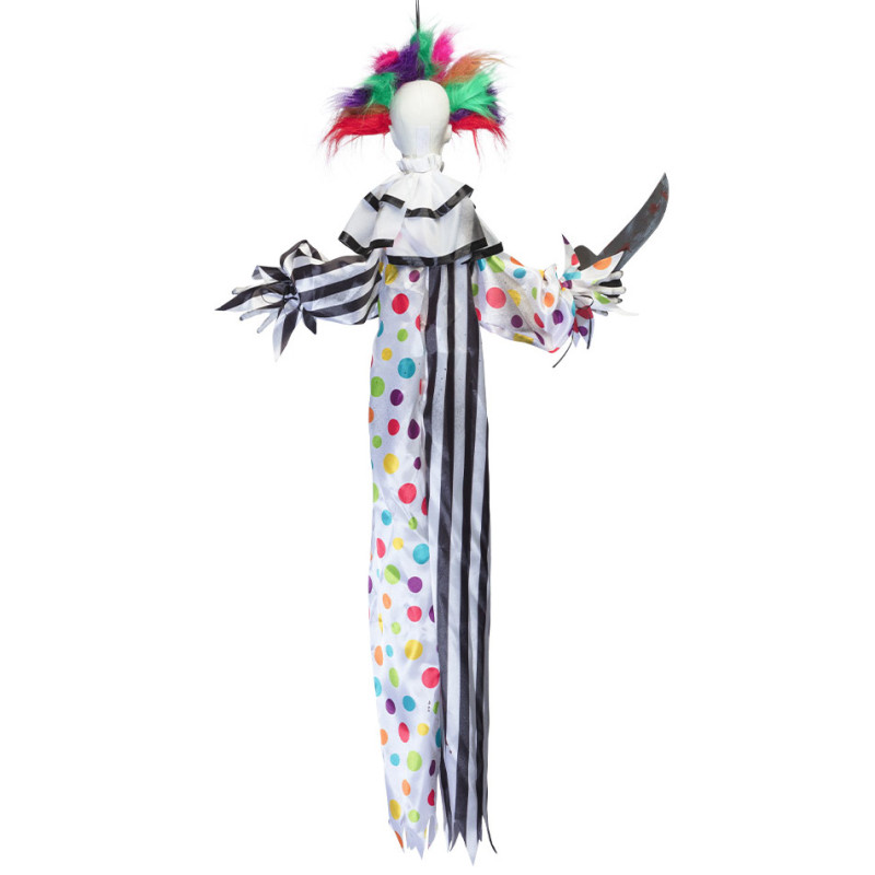 Cet automate de clown d'Halloween est habillé avec une collerette et un long vêtement décoré avec des points colorés et des rayures noires et blanches. Ce vêtement est couvert de taches de sang et le bas du pantalon est noirci. Il a deux bras articulés et un faux couteau noir en mousse (pas très réaliste) dans la main droite. Le visage de cet automate pour Halloween est maquillé à la façon de Ça le clown, avec un sourire narquois et des mèches de cheveux colorées qui partent dans tous les sens.