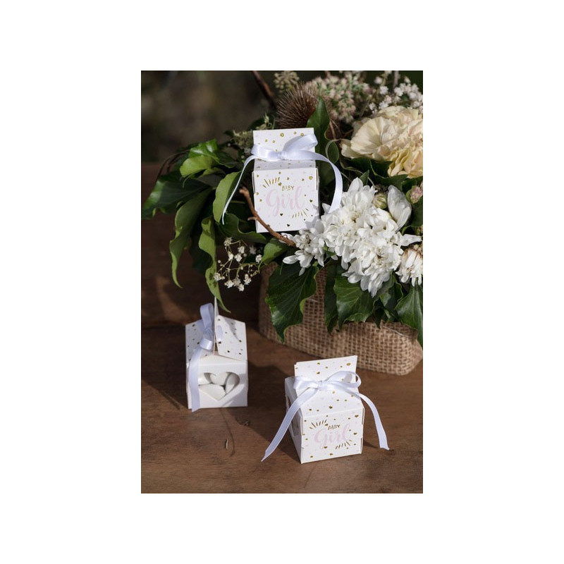 Le paquet contient 6 boîtes en carton baby shower fille en forme de petits paquets. Ces boîtes sont blanches avec deux inscriptions "baby girl" roses et dorées, ainsi que deux cœurs découpés dans les deux autres côtés. Elle mesure 4x4x4 cm et se ferme avec un petit ruban rose. Ces boîtes pour baby shower fille sont très faciles à monter, il suffit de les déplier. Dans notre rubrique dédiée à la déco baby shower fille, vous trouverez tout ce qu'il faut pour décorer la table.
