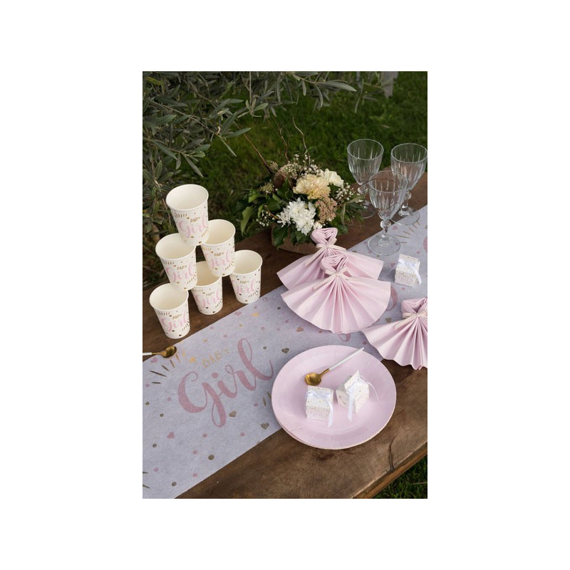 Pour accompagner ce chemin de table baby shower fille, nous proposons de nombreux accessoires décoratifs pour les tables comme des centres de table, des tops pour décorer les gâteaux, des confettis de table, ou encore de petites boîtes baby girl assorties dans lesquelles vous pourrez mettre des dragées.