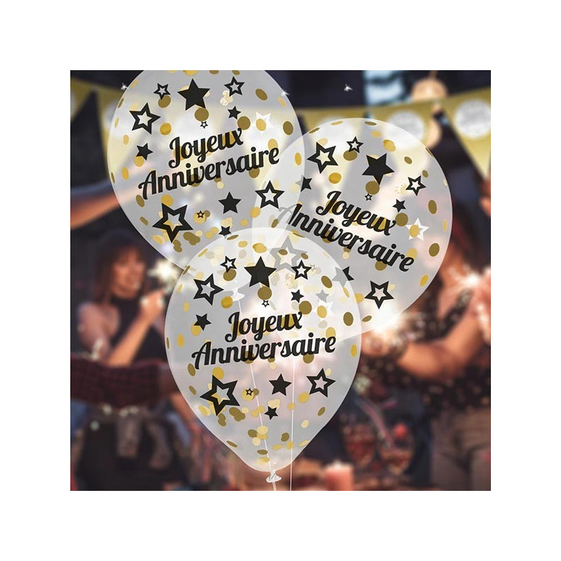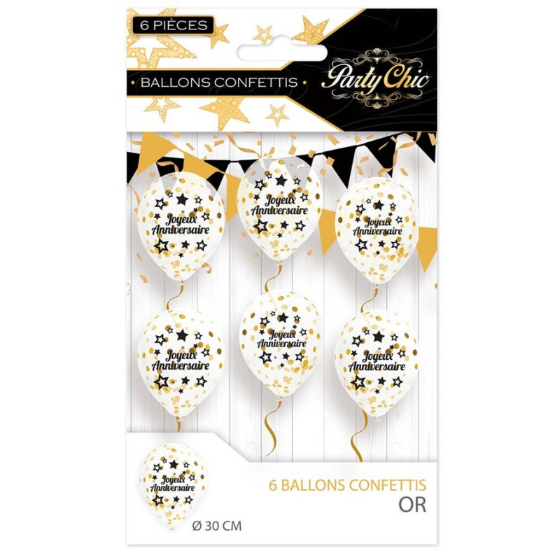 - 6 Ballons confettis anniversaire noir/or en latex, 30cm
