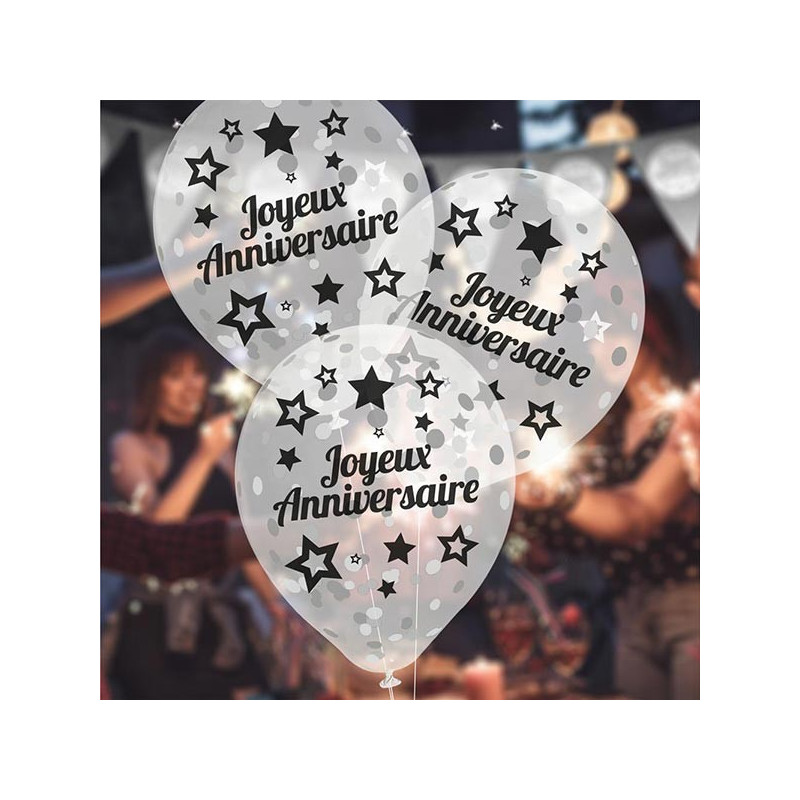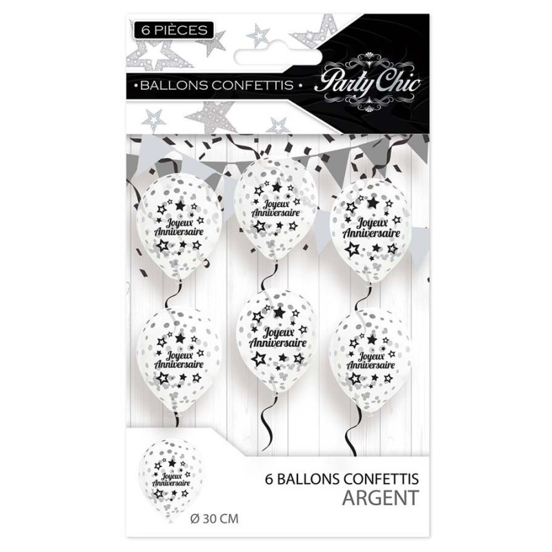 - 6 Ballons confettis anniversaire noir/argent en latex, 30cm