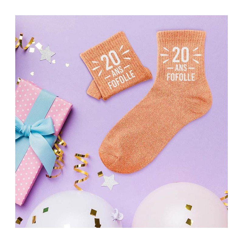 Que ce soit pour faire un cadeau à votre fille, une amie ou votre cousine, ces chaussettes d'anniversaire à paillettes 20 ans seront parfaites. Les chaussettes brillantes comme ce modèle sont très à la mode, elles pourront parfaitement être portées dans la vie quotidienne. Cela change des traditionnelles chaussettes orteils d'anniversaire, ce modèle est beaucoup plus joli. C'est un cadeau 20 ans qu'on a envie de porter !