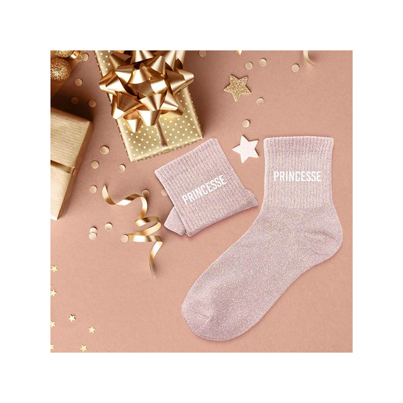 Cette paire de chaussettes à paillettes princesse est pour femme et de taille unique (36/42). Elles sont rose pastel avec de petits filaments dorés qui apportent un effet pailleté. Chaque chaussette est personnalisée avec deux inscriptions blanches "PRINCESSE". Ce modèle de chaussettes paillettes peut être une bonne idée pour faire un petit cadeau sympa à l'occasion de Noël, d'un anniversaire, d'une fête ou juste pour faire plaisir à quelqu'un de proche.
