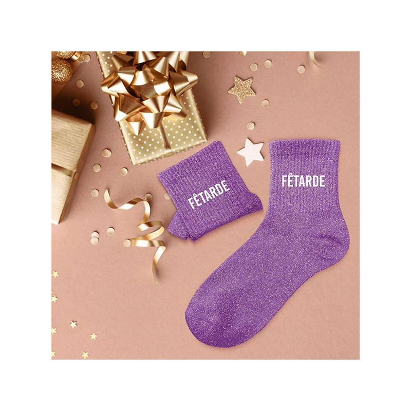 Ces chaussettes paillettes fêtarde sont pour femme et de taille unique (36/42). Elles sont violettes et personnalisées avec une écriture blanche "Fêtarde" qui est présente de chaque côté des chaussettes. Pour avoir cet effet pailleté, des fibres dorées sont mises dans les coutures des chaussettes. Une chose est sûre, avec ces chaussettes à paillettes aux pieds, vous allez faire sensation en soirée.
