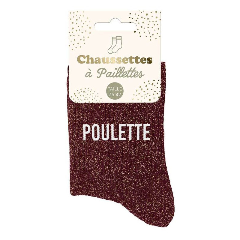 Cette paire de chaussettes à paillettes poulette est pour femme et de taille unique (36/42). Les chaussettes paillettes sont marron avec des fils métalliques couleur or très brillants, ce qui apporte un effet pailleté qui ressort très bien. Sur chacune des chaussettes, on retrouve à deux reprises le mot "POULETTE" qui est écrit en blanc. Si vous êtes à la recherche d'un petit cadeau marrant pour un anniversaire, Noël, un EVJF ou une fête, ces chaussettes sont une bonne idée.