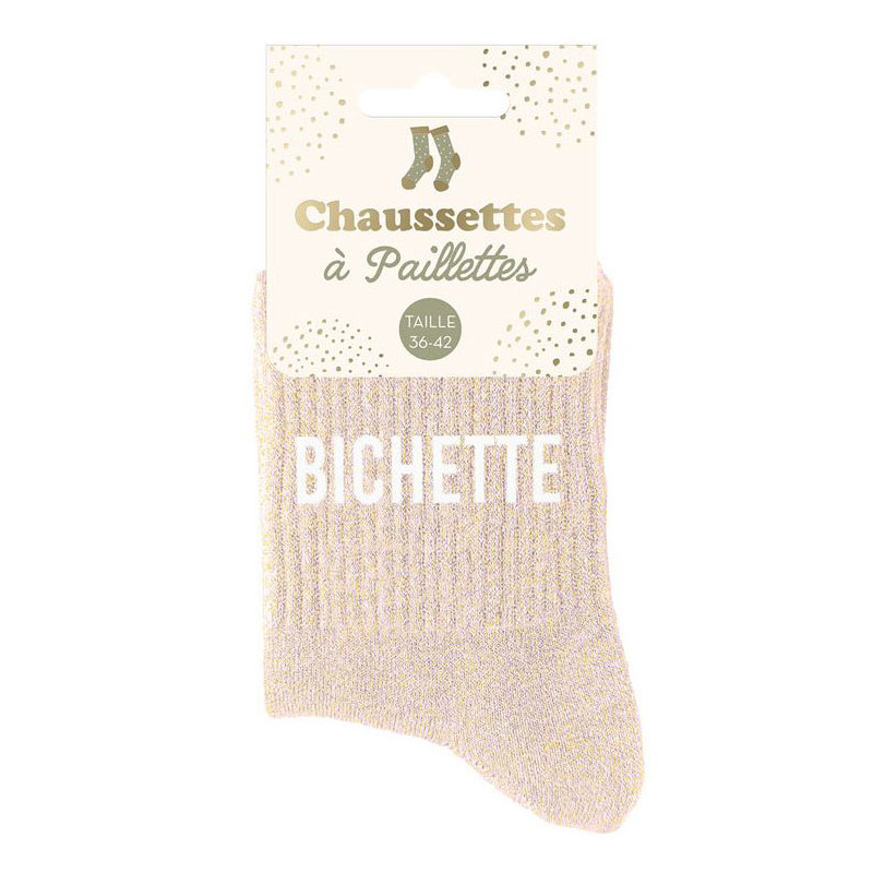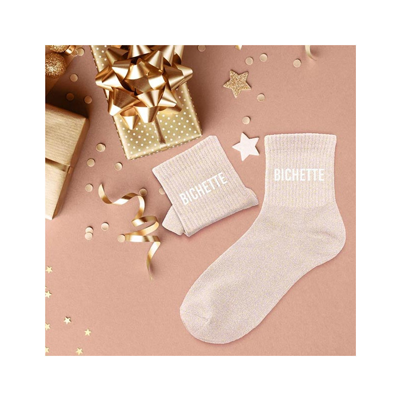 Ces chaussettes paillettes bichette pourront être offertes à une amie, à sa femme, à sa fille ou même à une collègue. Dans un style similaire, nous avons d'autres modèles comme les chaussettes à paillettes poulette, brunette, rebelle, gourmande, têtue, craquante, blondinette, pipelette...