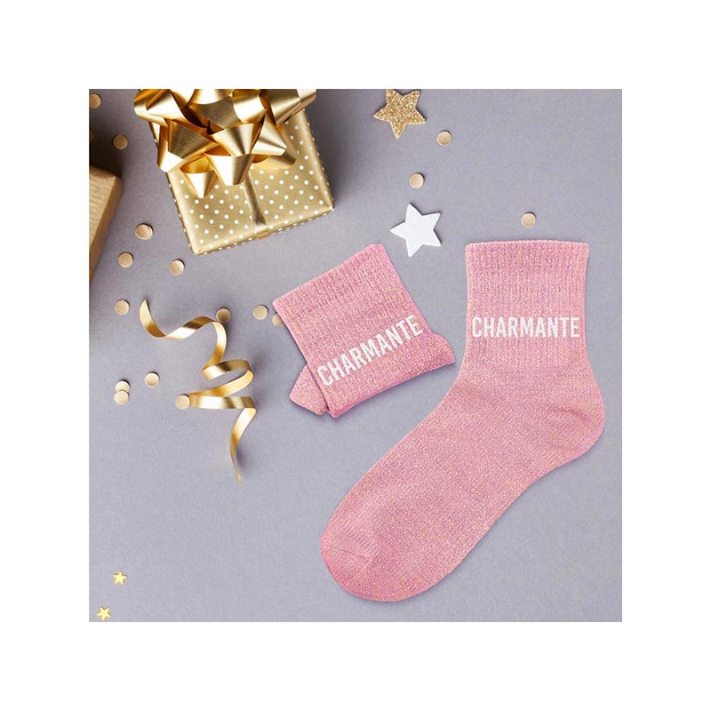 Cette paire de chaussettes paillettes charmante qui est composée à 55% de coton est pour femme. Les chaussettes paillettes sont roses et personnalisées avec le mot "CHARMANTE" qui est écrit en blanc, de chaque côté des chaussettes. Elles ont la particularité d'avoir des fils métalliques couleur or dans les coutures, ce qui apporte un effet pailleté à ces chaussettes charmante femme qui sont de taille unique (36/42).