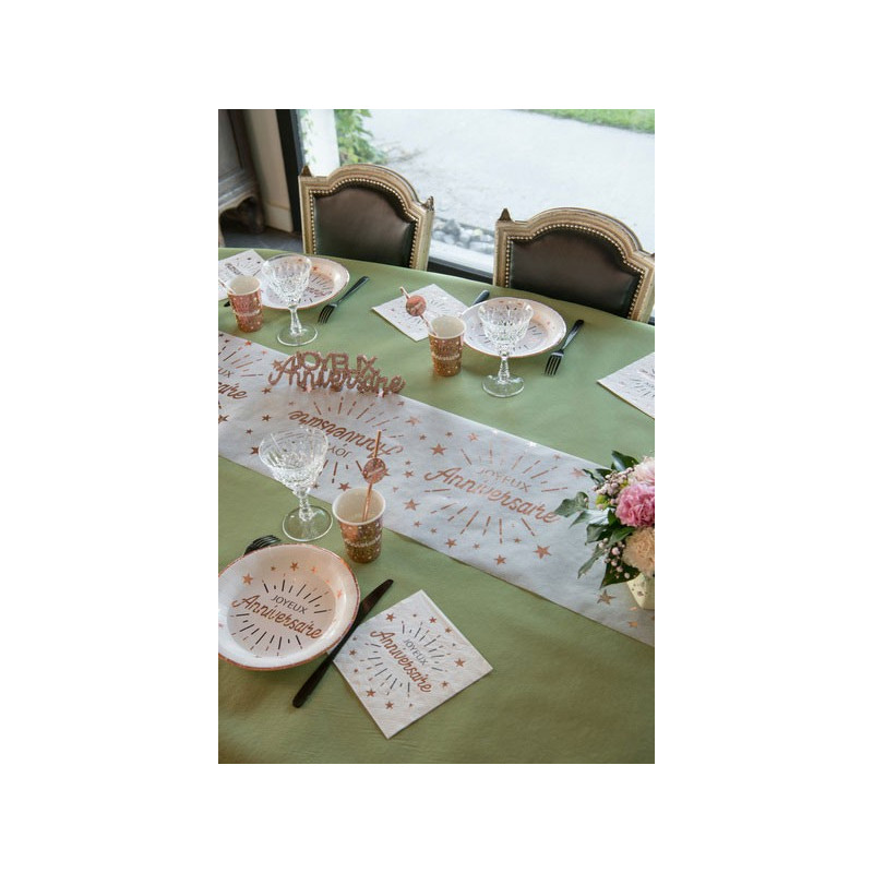 Vous trouverez également ce chemin de table anniversaire en blanc/argent et en noir/or. Pour accompagner ce beau chemin de table anniversaire rose gold, vous trouverez sur notre site de nombreuses décorations comme des centres de table, des bougies, des confettis de table ou encore de la vaisselle jetable en carton (assiettes, gobelets et serviettes en papier).