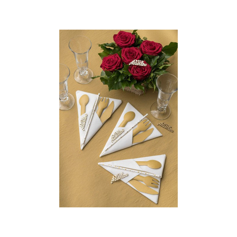 En plus des couverts jetables comme ces fourchettes, nous proposons un large choix en serviettes, gobelets, assiettes, marque-places, confettis de table, chemins de table, nappes centres de table et autres décorations. Il y a tout ce qu'il faut pour composer une table à l'occasion d'un évènement !