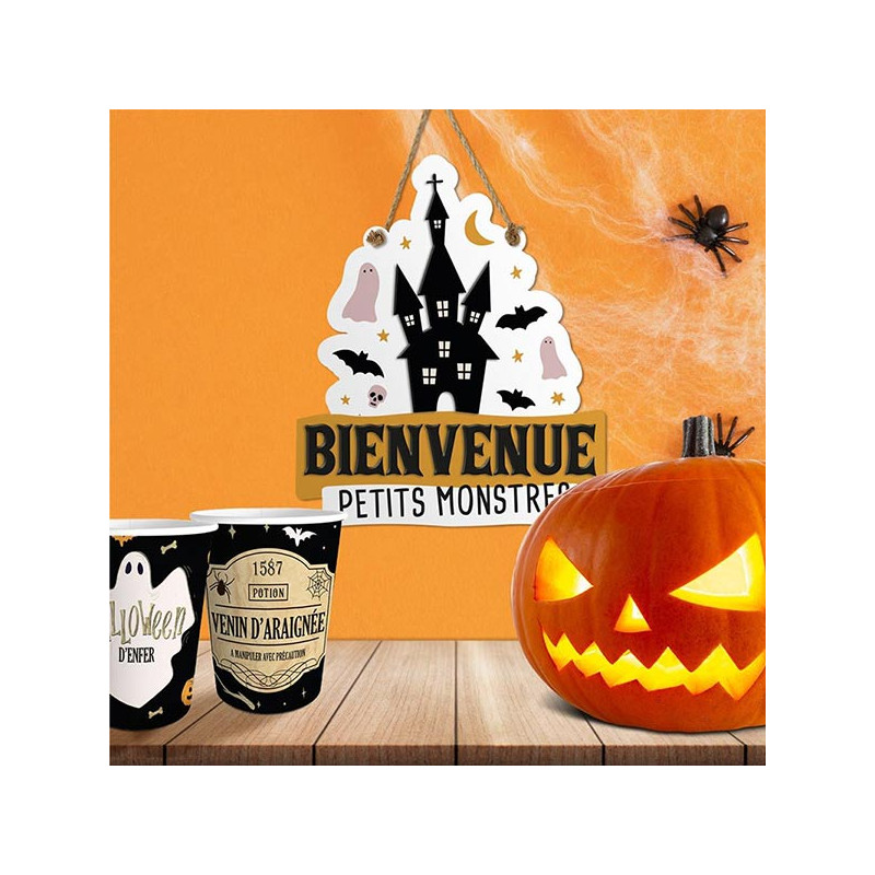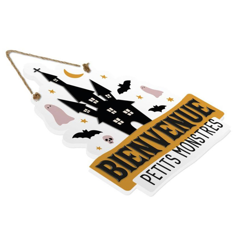 - 1 Plaque de porte Halloween en bois Bienvenue petits monstres 15x12,5cm