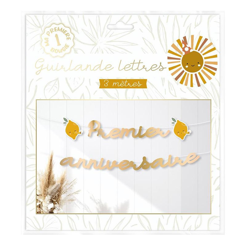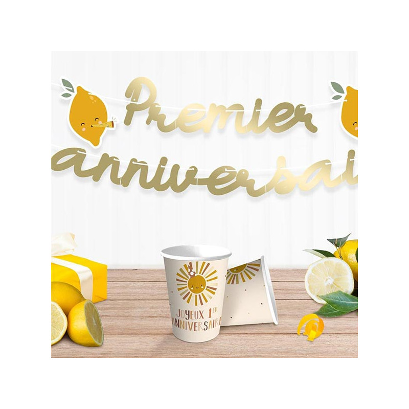 La guirlande premier anniversaire mesure 3 mètres de longueur et de 8 à 15 cm de hauteur (suivant les lettres). Elle est composée d'une inscription en carton dorée "Premier anniversaire" qui est entourée de deux citrons qui mesurent 22 cm. Cette inscription est attachée à un ruban blanc, tout comme les citrons pour former une guirlande d'anniversaire 1 an.