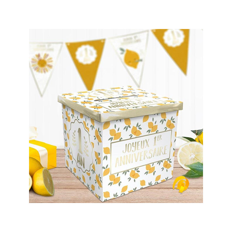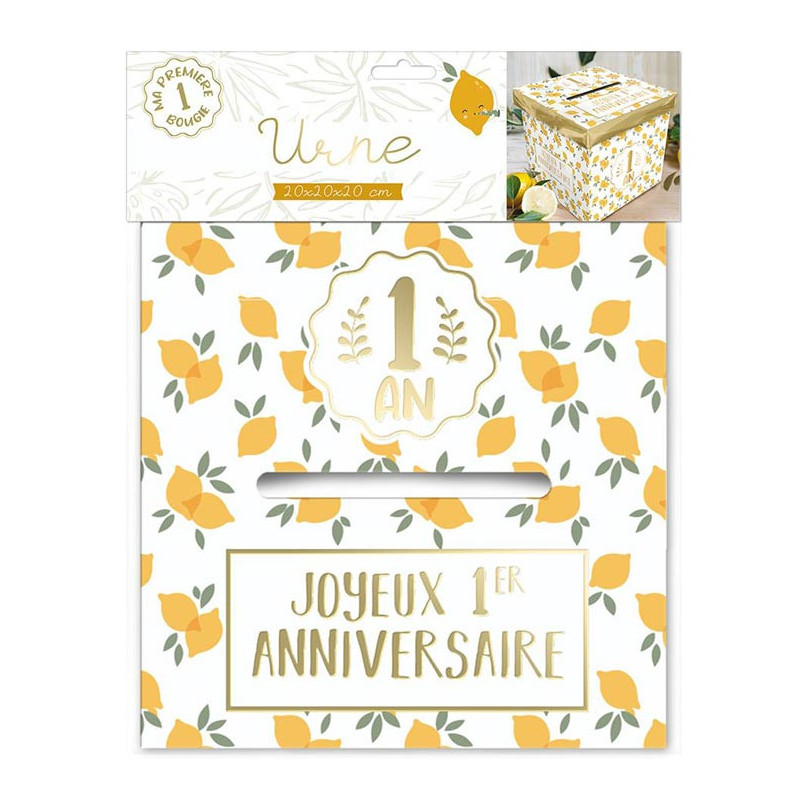 L'urne anniversaire 1 an est en carton et mesure 20x20x20 cm. Elle est blanche, décorée avec des citrons jaune/orange, ainsi que des inscriptions dorées "1 an" et "Joyeux 1er anniversaire". Une fente qui mesure 12 cm de longueur pour 1 cm de largeur est prévue dans le couvercle pour que tout le monde puisse déposer une carte d'anniversaire. Cette tirelire anniversaire 1 an est parfaitement assortie à notre gamme de déco d'anniversaire 1 an.