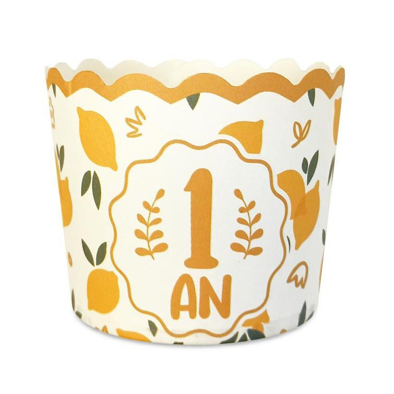 Le paquet contient 12 caissettes à cupcake 1 an cartonnées qui mesurent 6 cm de diamètre (à la base) et 5,5 cm de hauteur. Ces caissettes sont blanches et décorées avec un liseré orange qui est accompagné de citrons, de feuilles vertes et d'une inscription "1 an". Elles doivent être utilisées en décoration, pour masquer les caissettes de vos muffins/cupcakes. C'est parfait pour avoir une déco de table d'anniversaire bébé 1 an qui sera à 100% sur le thème de l'anniversaire 1 an.