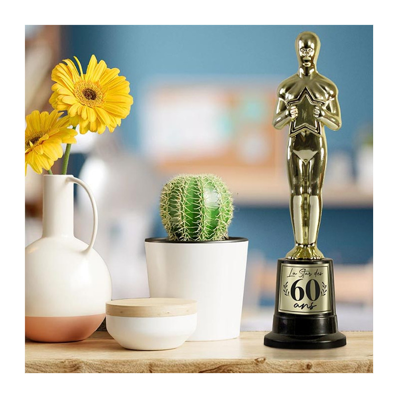 Ce trophée 60 ans style Oscar est un cadeau d'anniversaire humoristique qui sera idéal pour accompagner un cadeau un peu plus sérieux. Sur notre site, vous trouverez d'autres cadeaux amusants, comme le rouleau de papier toilette des 60 ans. Nous avons aussi de nombreux accessoires personnalisés avec l'âge 60 qui seront parfaits pour déguiser la personne qui célèbre ses 60 ans. Chapeaux, médailles, tee-shirts, lunettes, serre-têtes, écharpes de miss/mister et boxers, il y a tout ce qu'il faut.