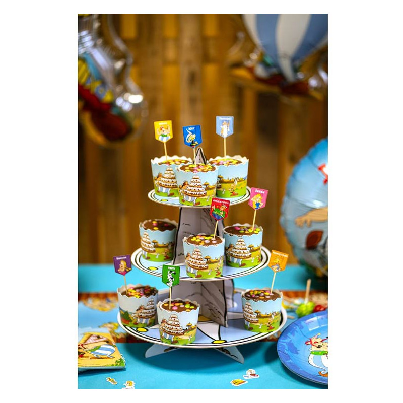 Pour décorer les cupcakes Astérix et Obélix, nous avons de petits pics en bois qui sont personnalisés avec différents gaulois du village. Ces pics peuvent aussi être mis en décoration sur un gâteau ou pour accompagner des amuse-bouches. Pour présenter vos cupcakes sur la table, nous proposons un support pour les poser en forme de menhir qui a 3 étages et mesure 36 cm. C'est parfait pour créer une décoration de table d'anniversaire qui fera sensation auprès des enfants et des adultes.