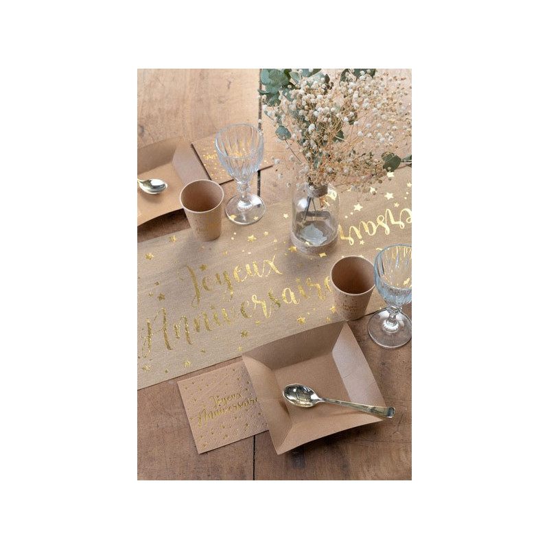 Le chemin de table nature anniversaire mesure 3 mètres de longueur et 28 cm de largeur. Il est couleur kraft et décoré avec des inscriptions "Joyeux Anniversaire" couleur or écrites dans les deux sens (pour que chaque côté de la table puisse lire) avec des étoiles autour. Ce chemin de table kraft anniversaire peut être découpé avec des ciseaux, c'est très pratique si vous avez plusieurs tables à décorer.