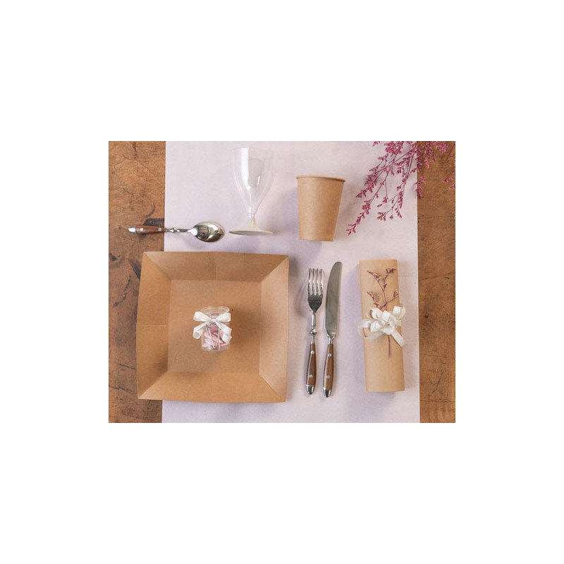 Ces assiettes naturelles kraft pourront être associées à une nappe blanche, un chemin de table en toile de jute ou encore de la décoration de table en bois. En plus de la vaisselle jetable, prévoyez des couverts en bois pour créer une table 100% naturelle.