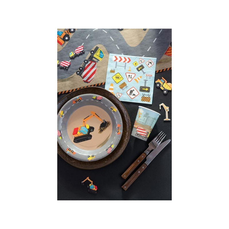 Le paquet contient 20 serviettes chantier en papier qui mesurent 16,5x16,5 cm pliées et 33x33 cm dépliées. Elles sont bleu pastel et décorées avec des panneaux de signalisation, des cônes de chantier et des panneaux de travaux qui sont présents sur les 4 faces. Ces serviettes d'anniversaire chantier font partie d'une gamme de vaisselle jetable dans laquelle vous trouverez les assiettes cartonnées assorties, ainsi que les gobelets en carton pour avoir un déco anniversaire chantier de table complète.