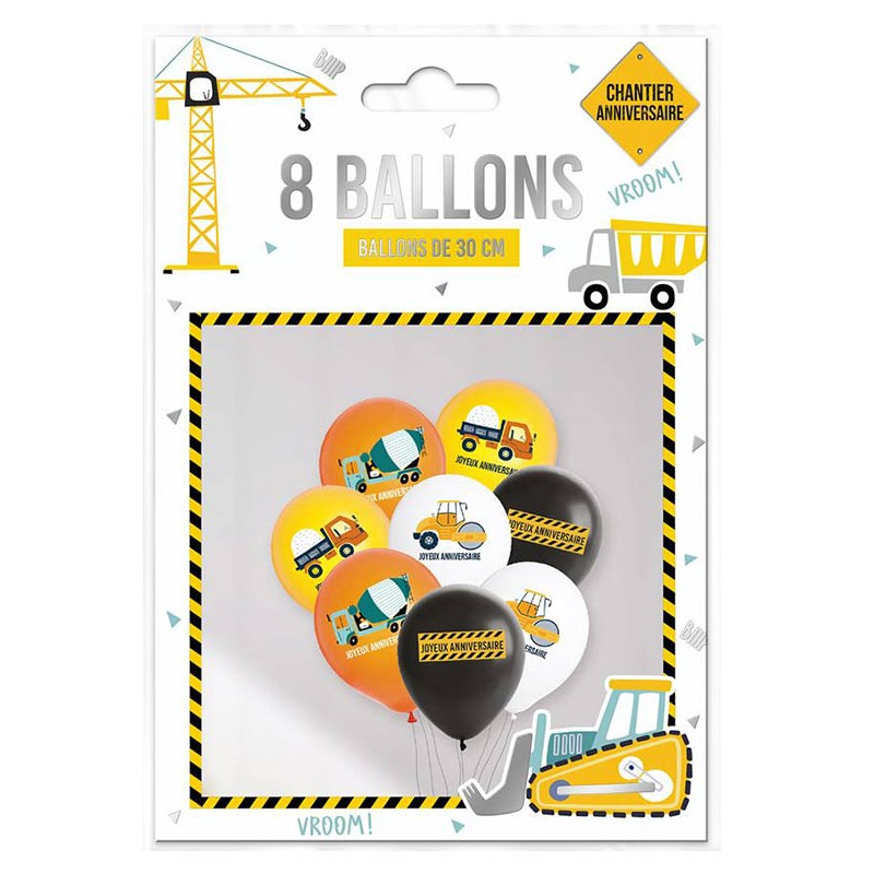 Ce paquet contient 8 ballons d'anniversaire sur le thème chantier et construction qui mesurent 30 cm de diamètre. Dans un paquet, vous trouverez 2 ballons blancs, 2 orange, 2 jaunes et 2 noirs. Ils sont tous décorés avec une illustration qui est accompagnée d'une inscription "Joyeux Anniversaire". Ces ballons engins de chantier sont en latex 100% naturel et gonflables à l'air ou à l'hélium.