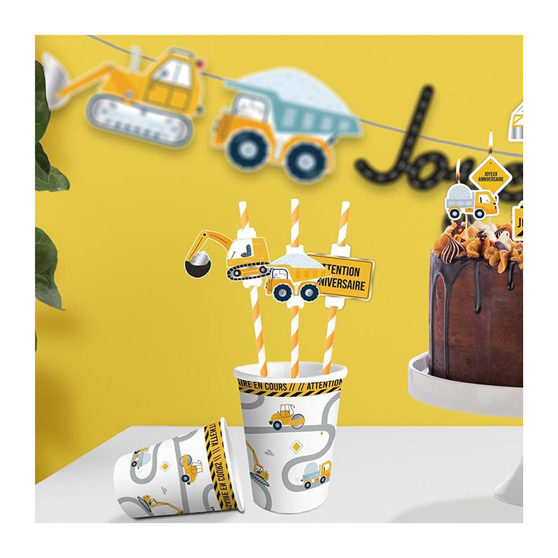 Pailles Anniversaire thème Chantier en Carton x12