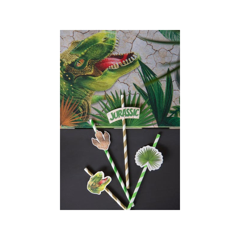 Le paquet contient 8 pailles en carton dinosaure qui mesurent 19 cm de hauteur. Ces pailles sont décorées avec des spirales vertes/blanches et kaki/blanches. Elles sont décorées avec de petits badges en carton en forme de tête de t-rex, d'empreinte de dinosaure, de feuille de palmier et d'inscription "Jurassic". Ce modèle de pailles dinosaure est parfaitement assortie à notre gamme anniversaire dinosaure qui est composée de gobelets en carton, de serviettes et d'assiettes.