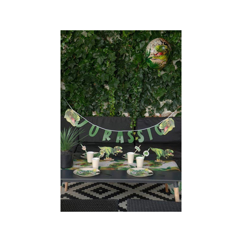 La guirlande anniversaire dinosaure mesure 5 mètres de longueur. Elle est composée de 8 lettres en papier glacé qui mesure environ 15 cm de hauteur avec des têtes de T-rex aux extrémités et forment le mot "Jurassic". Tous les fanions de cette banderole dinosaure sont attachés à un ruban noir. Pour accompagner cette guirlande dinosaure, vous trouverez des ballons à gonfler décorés avec des dinosaures. C'est le top pour réaliser une décoration dinosaure anniversaire.