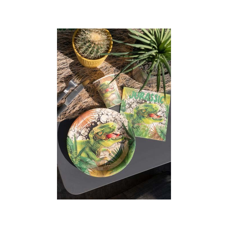Le paquet contient 10 assiettes en carton sur le thème des dinosaures qui mesurent 22,5 cm de diamètre. Ces assiettes dinosaure sont légèrement creuses (ce qui est assez pratique) et décorées avec un T-rex, des feuilles tropicales et de la roche brisée. Avec ces assiettes, vous pourrez facilement réaliser une décoration anniversaire thème dinosaure pour faire plaisir à un enfant. En effet, sur notre site vous trouverez des gobelets en carton assortis, ainsi que des pailles et des serviettes en papier.