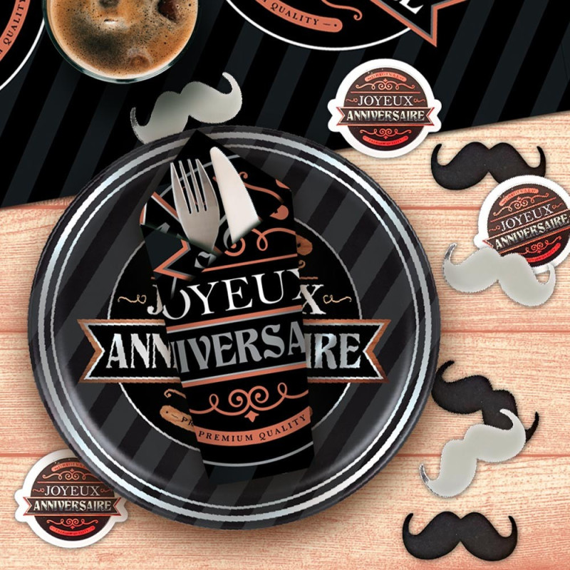 Pour compléter une décoration de table d'anniversaire pour homme, vous trouverez dans la même gamme des chemins de table avec des moustaches. Pour la table, il existe aussi les assiettes en carton, les serviettes en papier, les gobelets en carton, les centres de table et les tops pour décorer le gâteau d'anniversaire. Ces produits de décorations d'anniversaire homme sont noirs, argent et couleur bois.
