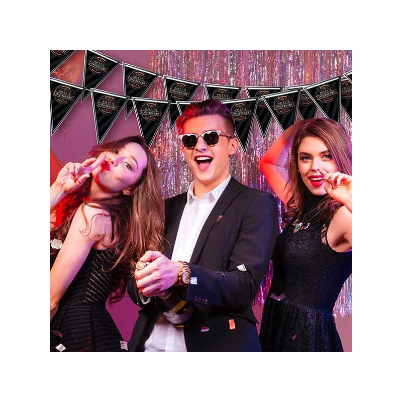 La guirlande fanion anniversaire mesure 3 mètres de longueur. Elle est composée de 10 fanions en carton (15x21 cm) noirs avec les bordures couleur argent et une inscription "Joyeux anniversaire" en blanc et imitation bois au milieu. Les fanions sont accrochés à un ruban blanc qui mesure 3 mètres, si besoin, il est possible de les resserrer pour diminuer la taille de cette guirlande. Avec les banderoles et les ballons assortis, vous pourrez facilement créer une déco d'anniversaire homme très chic.