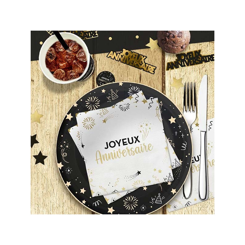 Serviettes Anniversaire Blanc/Noir/Or x10