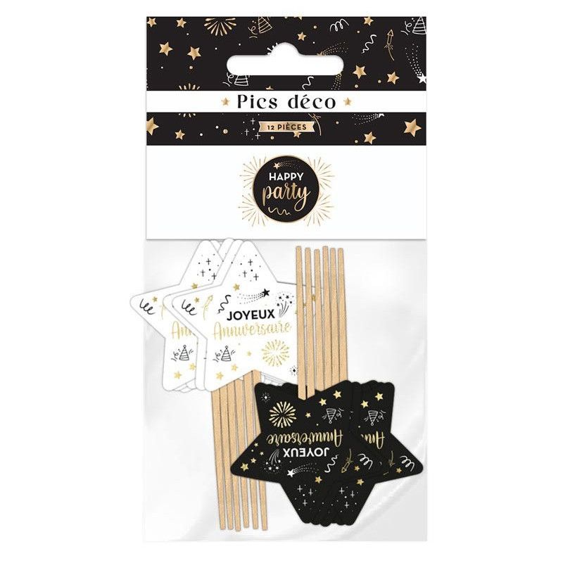 Pics Décoration Gâteau Anniversaire noir/blanc/or x12