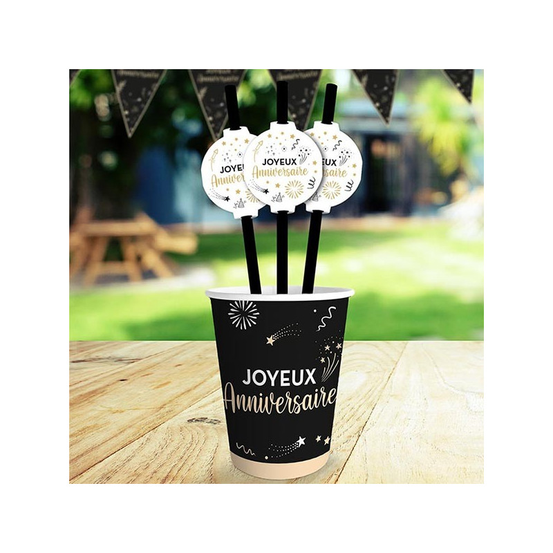 Pailles en Carton Anniversaire noir/blanc/or x12