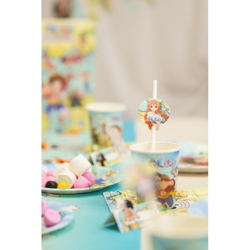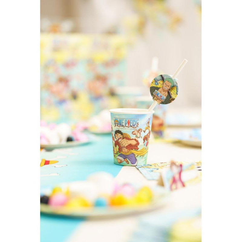 En plus des pailles One Piece, vous trouverez de nombreuses autres décorations sous licence officielle One Piece. Il existe une gamme de vaisselle jetable en carton complète qui est composée des assiettes, des gobelets, de serviettes en papier et d'une nappe. Pour compléter la décoration de la table d'anniversaire One Piece, nous avons le chemin de table, ainsi que les marque-places.