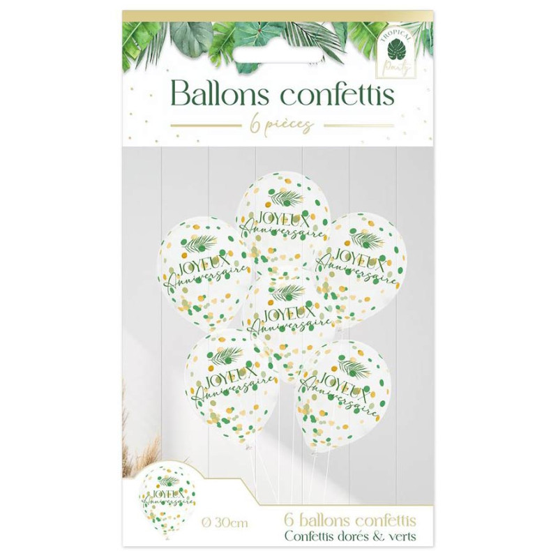 - 6 Ballons confettis joyeux anniversaire tropical en latex 30cm