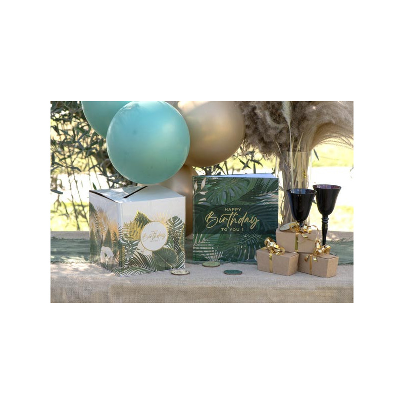 Pour accompagner cette urne spéciale anniversaire, vous trouverez dans la même gamme le livre d'or, le centre de table, les gobelets, le chemin de table, les serviettes, les confettis de table, ainsi que les assiettes. Tous ces produits sont assortis, c'est l'idéal pour composer une déco d'anniversaire thème jungle tropicale chic qui sort de l'ordinaire.