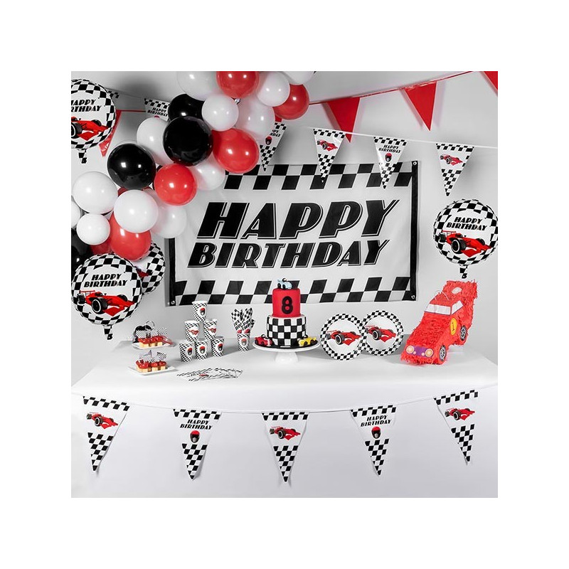 En plus de ces assiettes voiture d'anniversaire et de la vaisselle jetable, vous trouverez d'autres décorations comme des drapeaux à damier, de petits pics pour les amuse-bouches, des ballons à gonfler, des guirlandes fanion, des nappes ou encore des banderoles.