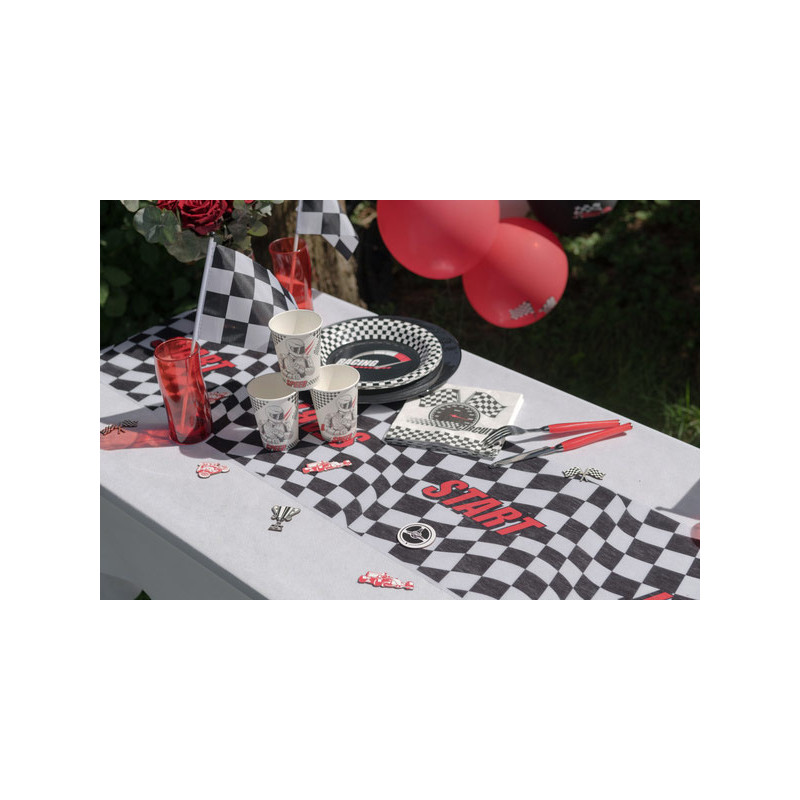Pour accompagner ce chemin de table et compléter votre décoration d'anniversaire voiture de course, nous avons dans la même gamme des confettis de table, des bougies, des drapeaux à damier, des centres de table, des pics décoratifs, des nappes ainsi qu'une gamme de vaisselle jetable en carton (assiettes, serviettes, gobelets).