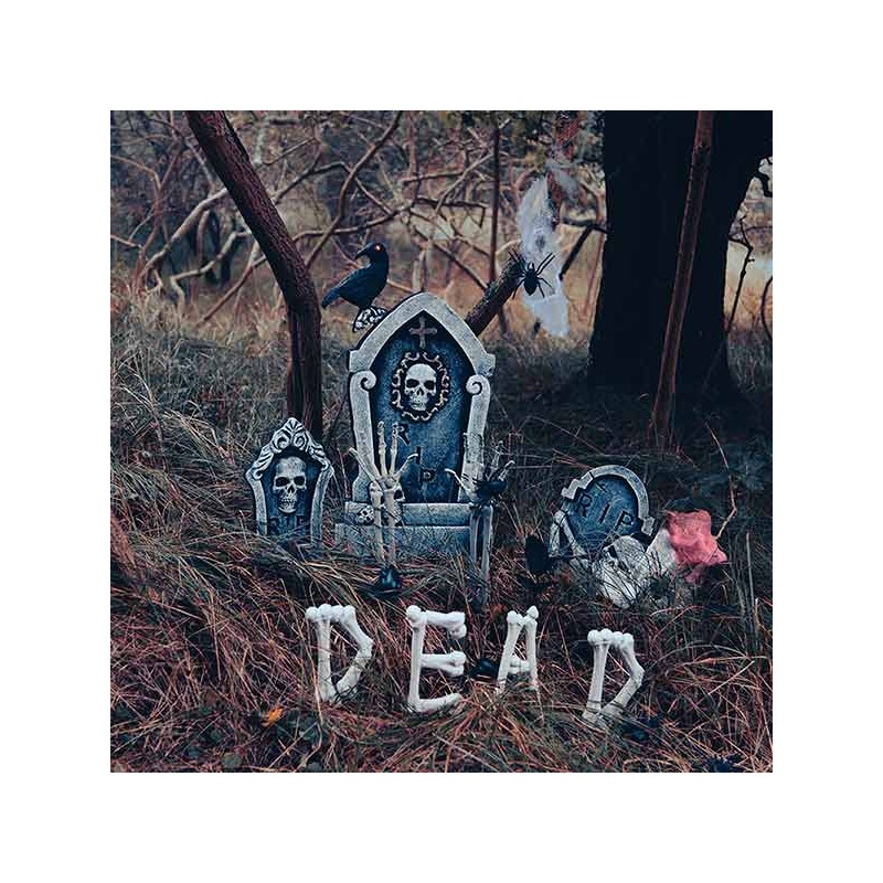 Inclus : 1 Grande pierre tombale (55x33cm) et 2 petites, 1 toile d'araignée, 1 rose noire, 1 corbeau, 1 filet sanglant, 4 rats, 7 araignées, (10x10 cm), 2 bras de squelette (38cm), 4 lettres en os pour former le mot "DEAD"