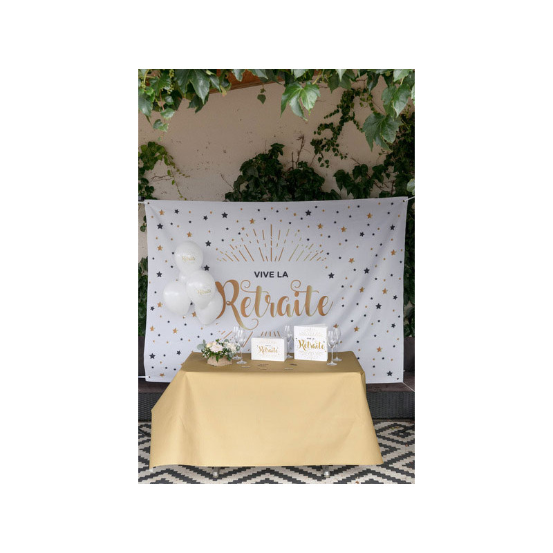 Cette toile de fond vive la retraite pourra être utilisée de manière classique dans une décoration retraite, mais aussi pour mettre en fond si vous avez prévu un espace photobooth. En effet, la bannière est parfaite pour se rappeler de l'évènement, lorsque vous révérez les photos quelques années après. Vous pouvez compléter la décoration en mettant des ballons autour, mais aussi des guirlandes.
